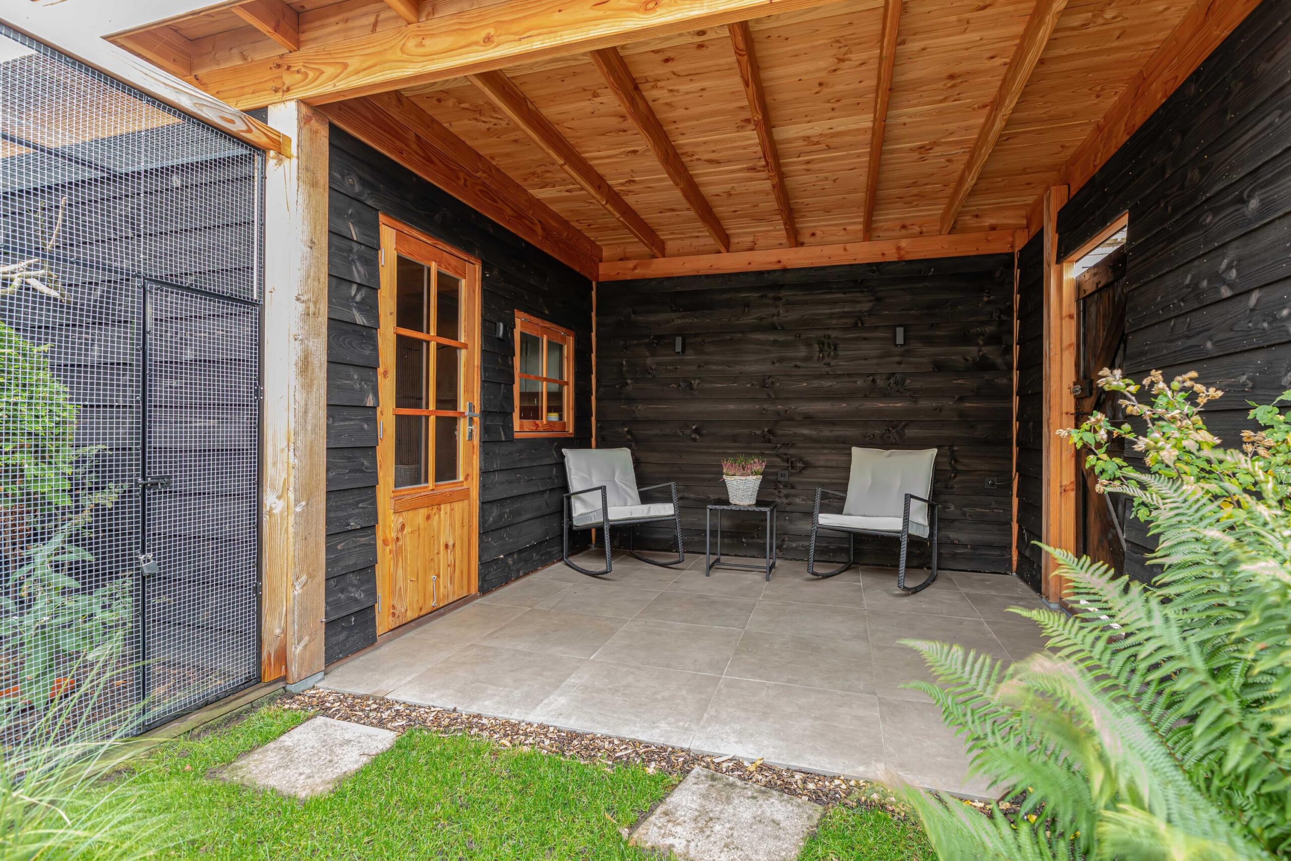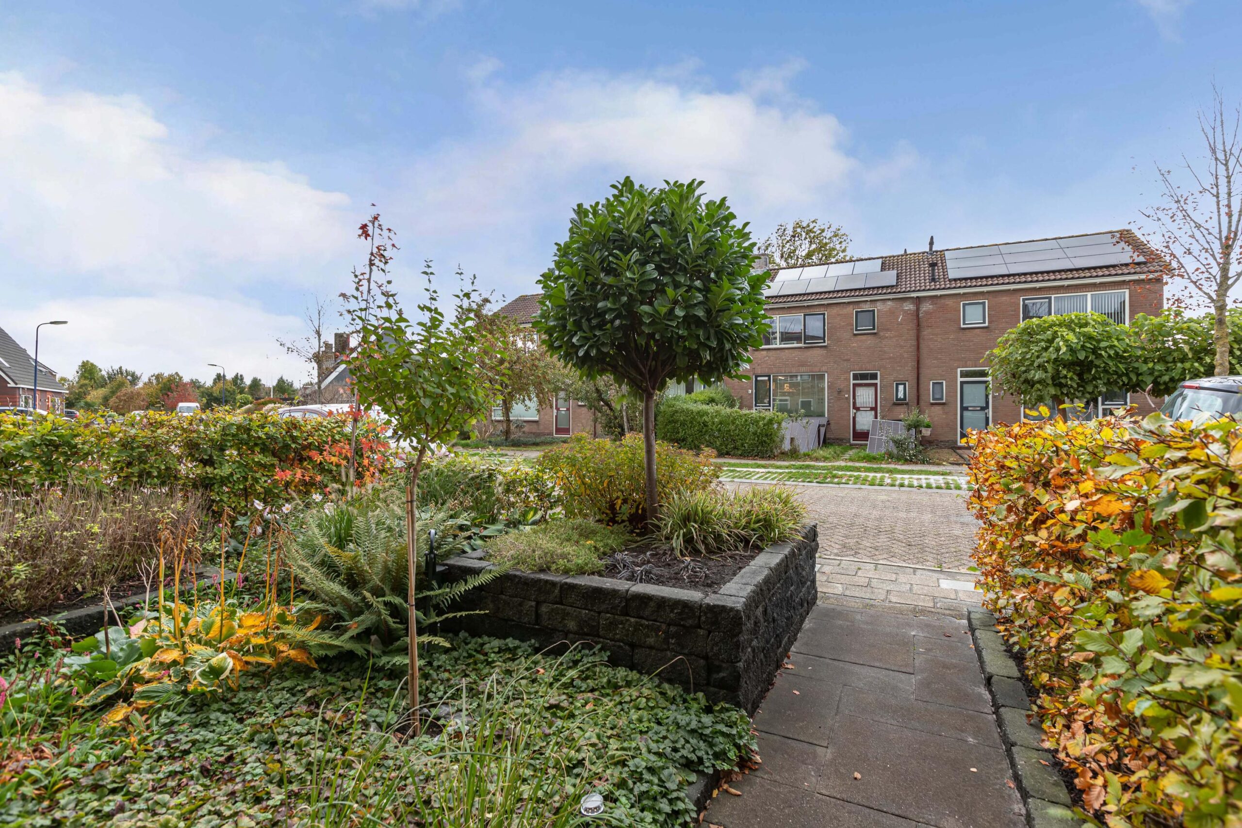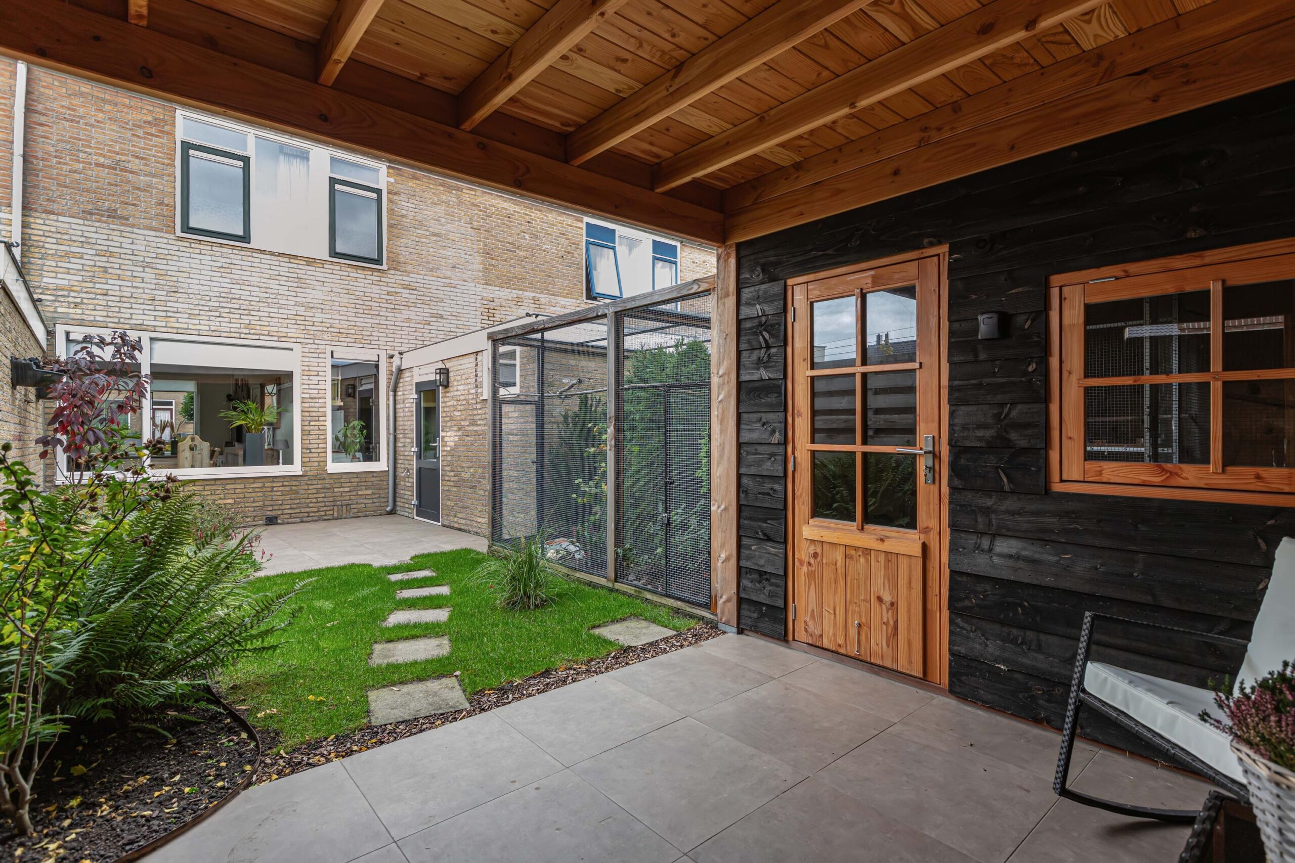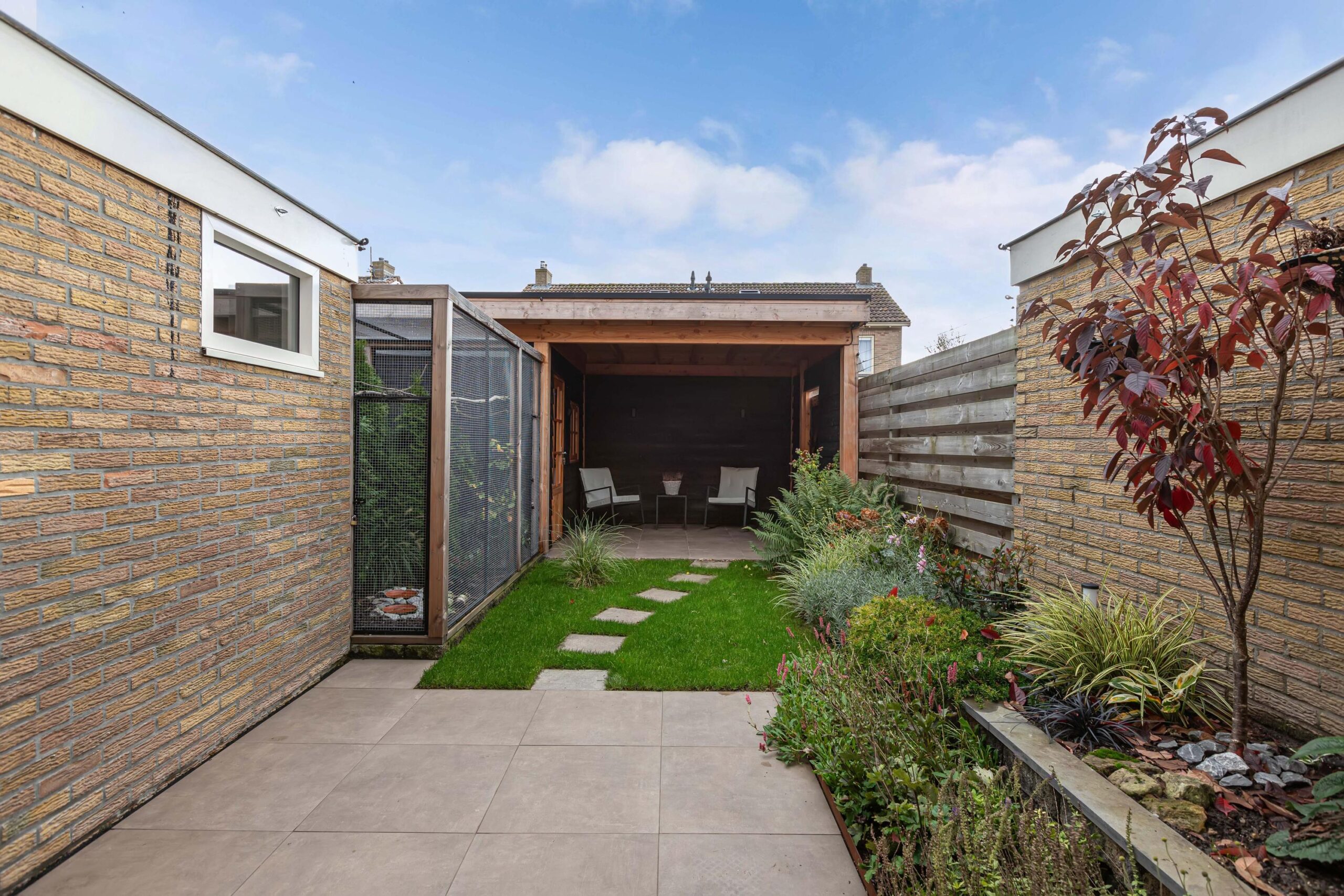 De voortuin is fraai aangelegd met sierbestrating, diversiteit aan beplanting en een decoratieve vijver. Langs de erfafscheidingen staat een mooie haagbeuk. De achtertuin is gesitueerd op het zuidoosten en is een heerlijke plek om van het buitenleven te genieten. Direct achter de woning ligt een royaal terras, uitgevoerd in grote vierkante tegels die zijn gevoegd en voorzien van een bronzen drain die het regenwater op stijlvolle wijze afvoert. Het gazon en de borders met vaste planten zorgen voor een groene en verzorgde uitstraling. Achter in de tuin is een overkapping gerealiseerd, waarvan een gedeelte dicht is voor het stallen van spullen en een gedeelte open is als beschutte zitplek. Een groot pluspunt is de uitzonderlijk brede steeg achterlangs voor het achterom. Deze steeg is royaal van formaat en biedt genoeg ruimte voor bijvoorbeeld een motor of het verplaatsen van een bakfiets. In de straat zijn voldoende openbare parkeerhavens.