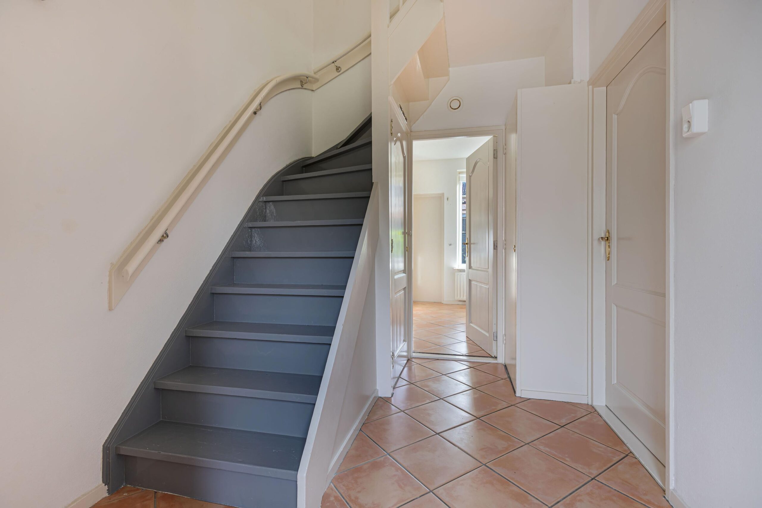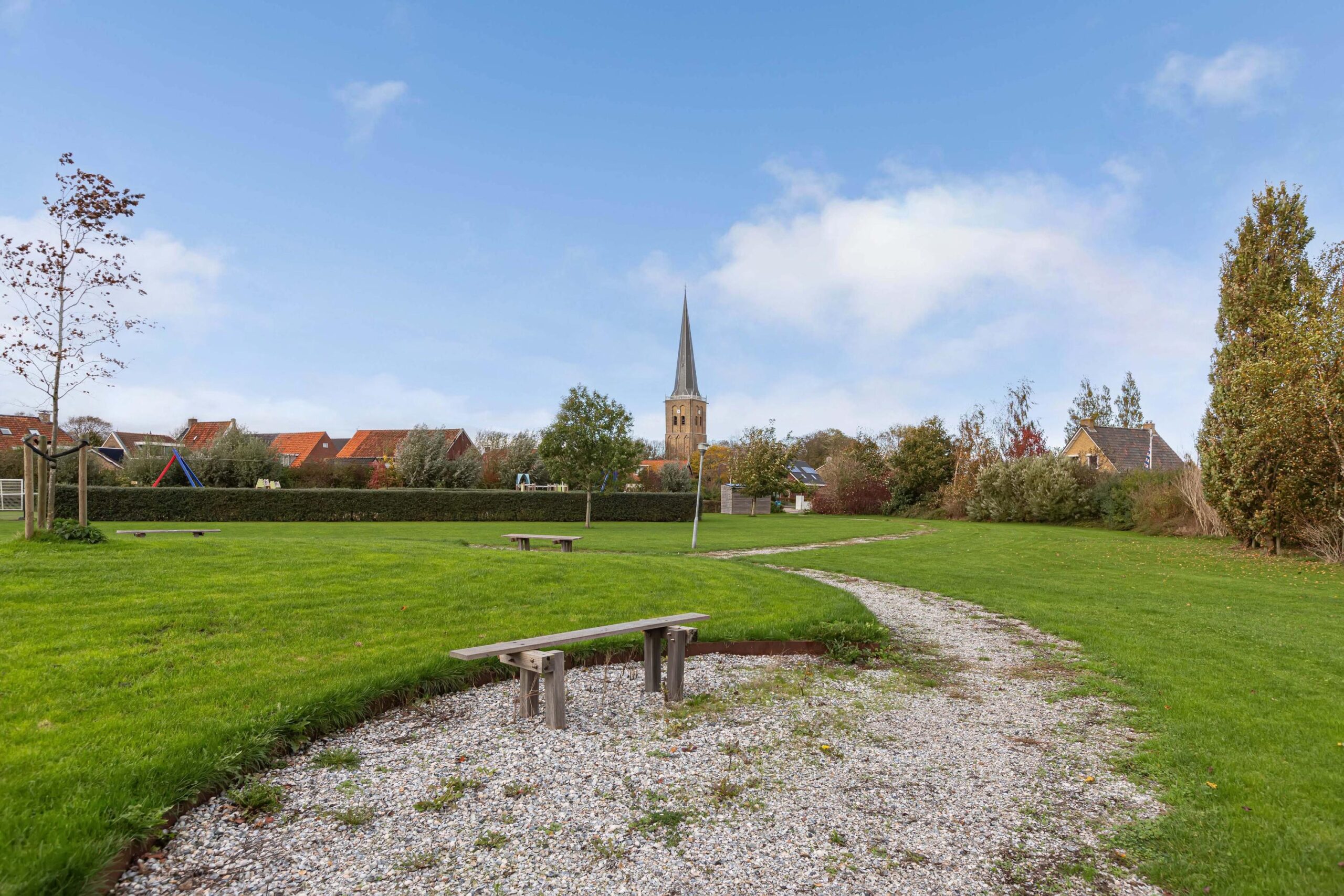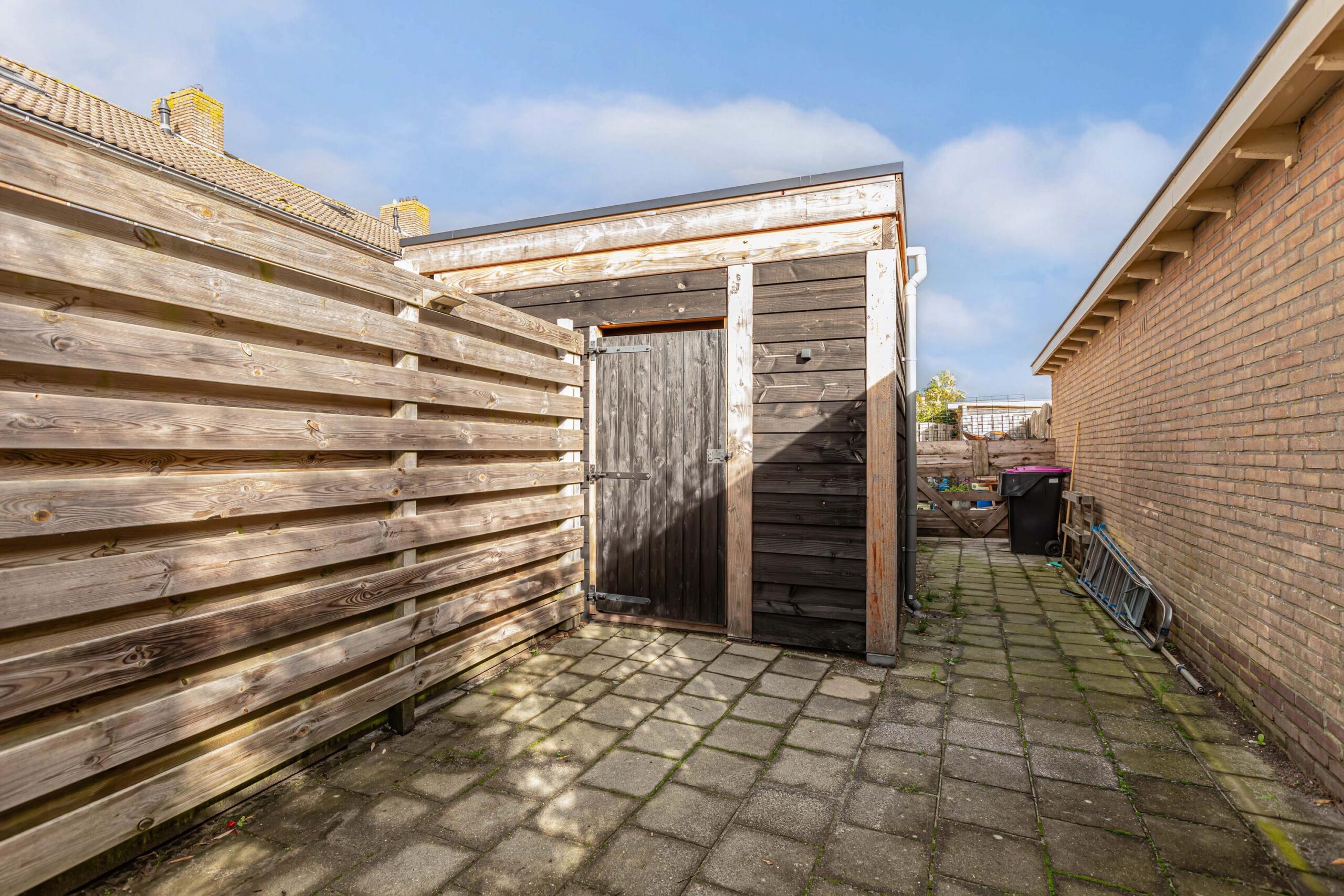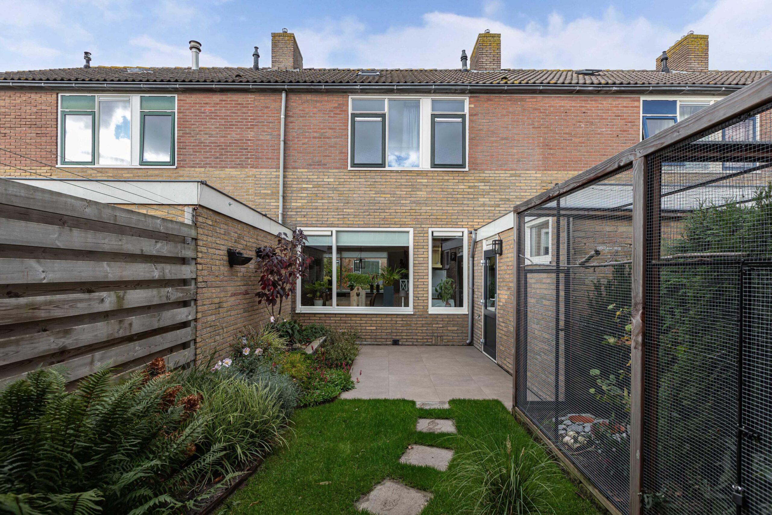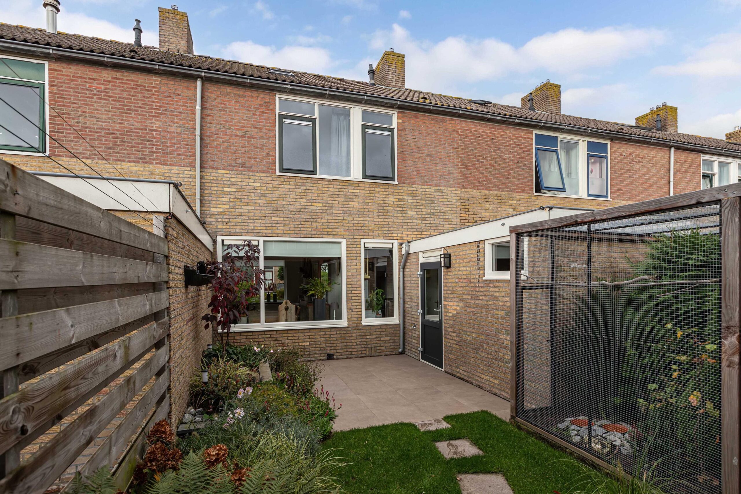 De voortuin is fraai aangelegd met sierbestrating, diversiteit aan beplanting en een decoratieve vijver. Langs de erfafscheidingen staat een mooie haagbeuk. De achtertuin is gesitueerd op het zuidoosten en is een heerlijke plek om van het buitenleven te genieten. Direct achter de woning ligt een royaal terras, uitgevoerd in grote vierkante tegels die zijn gevoegd en voorzien van een bronzen drain die het regenwater op stijlvolle wijze afvoert. Het gazon en de borders met vaste planten zorgen voor een groene en verzorgde uitstraling. Achter in de tuin is een overkapping gerealiseerd, waarvan een gedeelte dicht is voor het stallen van spullen en een gedeelte open is als beschutte zitplek. Een groot pluspunt is de uitzonderlijk brede steeg achterlangs voor het achterom. Deze steeg is royaal van formaat en biedt genoeg ruimte voor bijvoorbeeld een motor of het verplaatsen van een bakfiets. In de straat zijn voldoende openbare parkeerhavens.